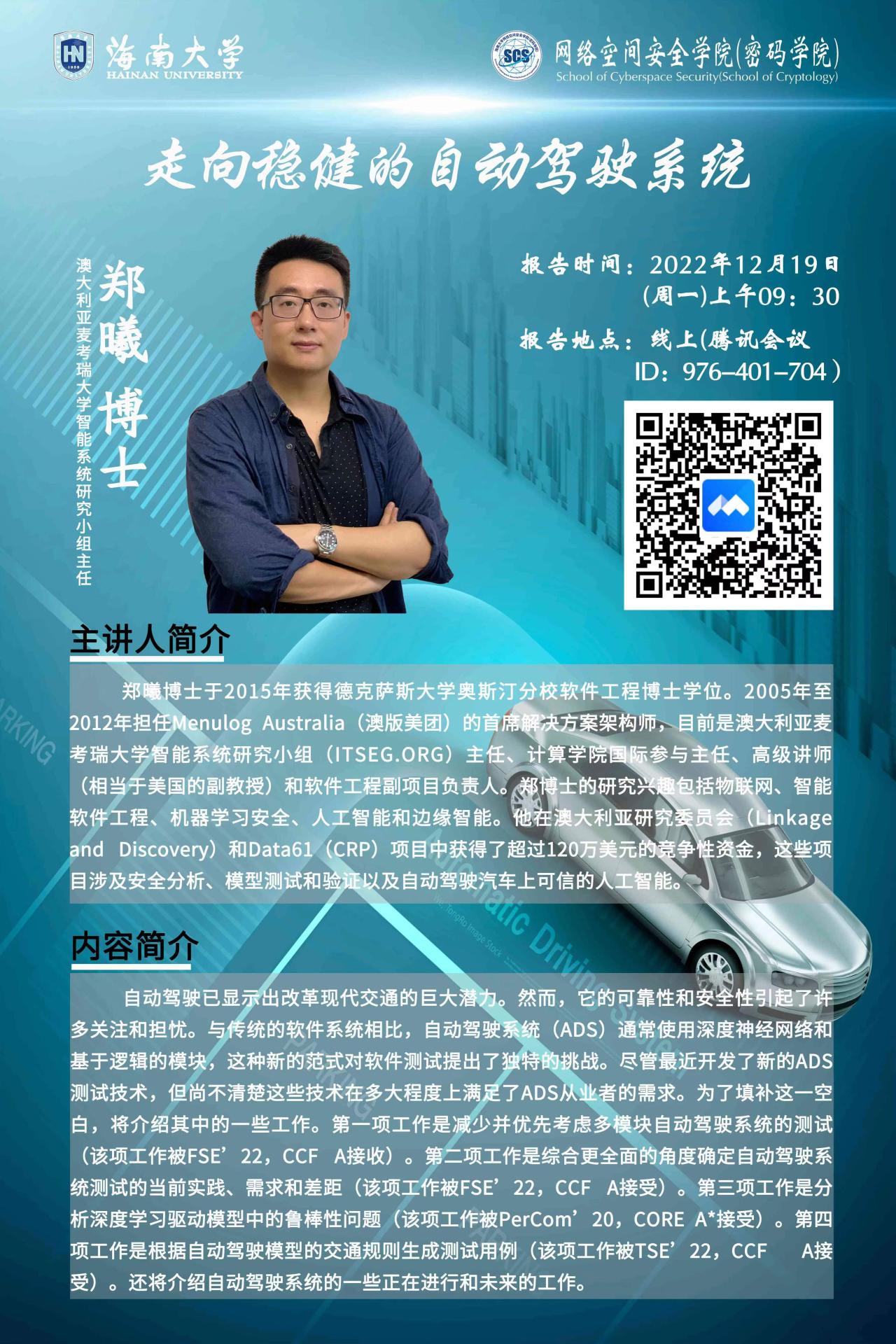 主讲人简介:郑曦博士于2015年获得德克萨斯大学奥斯汀分校软件工程博士学位。2005年至2012年担任Menulog Australia(澳版美团)的首席解决方案架构师,目前是澳大利亚麦考瑞大学智能系统研究小组(ITSEG.ORG)主任、计算公司国际参与主任、高级讲师(相当于美国的副教授)和软件工程副项目负责人。郑博士的研究兴趣包括物联网、智能软件工程、机器学习安全、人工智能和边缘智能。他在澳大利亚研究委员会(Linkage and Discovery)和Data61(CRP)项目中获得了超过120万美元的竞争性资金,这些项目涉及安全分析、模型测试和验证以及自动驾驶汽车上可信的人工智能。