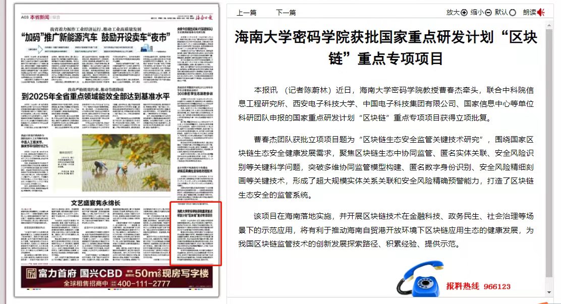 海南日报报道:英国365集团官网密码公司曹春杰教授团队获批国家重点研发计划“区块链”重点专项项目