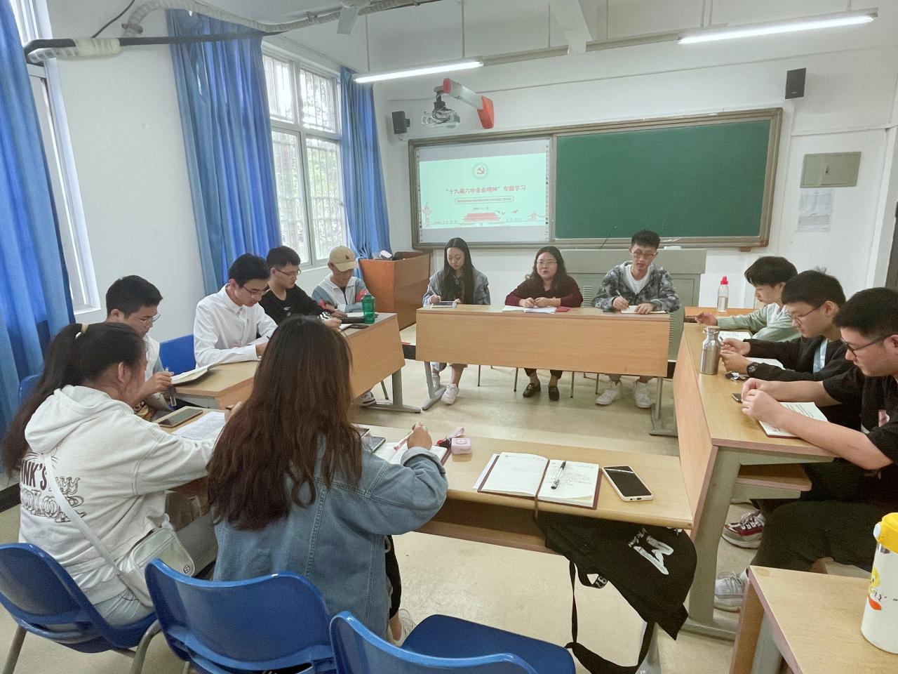 2021年11月30日,英国365集团官网本科生第二党支部在5号教学楼118教室专题学习了党的十九届六中全会精神,全体党员、发展对象代表参加了会议。