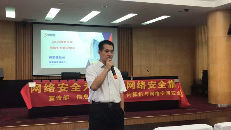 在本次网络空间安全宣讲活动中,我们有幸邀请到了海南省委网信办网络安全处处长黄坚敏、安恒信息技术股份有限公司主任陈宇乾、奇安信渠道技术总监田海燕等专家来英国365集团官网进行网络空间安全的知识讲座。