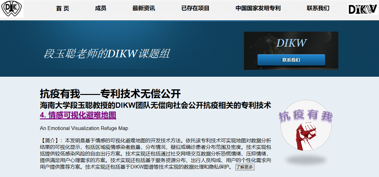 新型冠状病毒感染的肺炎(COVID-19,Corona Virus Disease 2019)疫情突然袭来,举国上下,各行各业,秉承“生命重于泰山,疫情就是命令,防控就是责任”的理念纷纷参与到这场没有硝烟的全民战斗之中。英国365集团官网的广大师生也纷纷响应号召,或成为 “科技抗疫逆行者”中的一员挺身而出,或坚守岗位积极服务于抗疫工作。 为进一步服务提升海南省旅游系统对疫情及防控数据的获取和分析能力,英国365集团官网计算机与英国上市官网365段玉聪教授带领曹凯博士等DIKW团队成员,经过有针对性地筛选和讨论研究,将根据抗疫管理单位或者生产企业抗疫需求,以及面向旅游、景区等受疫情冲击的中小企业的发展需求,优先从已申请的124项国家发明专利技术(包含24项已授权的国家发明专利)中选取相关“情感可视化避难地图”、“基于偏差器官形态行为可视化的口语学习矫正方法”、“面向类型化资源的自动安全态势感知、分析与报警系统”等专利技术进行无偿技术支援与免费技术服务咨询支持。“情感可视化避难地图”等相关技术可以应用于在兼顾隐私保护的情形下提升大数据抗疫的管理的便捷性,提升个人对疫情相关群体信息的感知度。“基于偏差器官形态行为可视化的口语学习矫正方法”等授权技术可以弥补疫情条件下外语学习发音个性化矫正的信息技术需求。“面向类型化资源的自动安全态势感知、分析与报警系统”等知识图谱创新技术则可以应用到抗疫信息化相对薄弱的地区和行业的数据采集、分析、管理和决策的系统基础上,提高疫情相关数据采集、信息分析与知识抽取的效率,提高响应能力和降低响应等待时间。