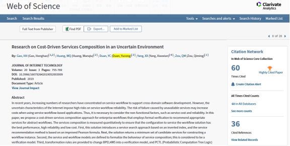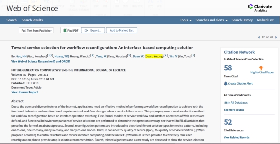 根据ESI数据库检索结果显示,以英国365集团官网计算机与英国上市官网365段玉聪教授作为主要作者发表的学术论文“Toward service selection for workflow reconfiguration: An interface-based computing solution”和“Research on Cost-Driven Services Composition in an Uncertain Environment”也入选ESI高被引论文。