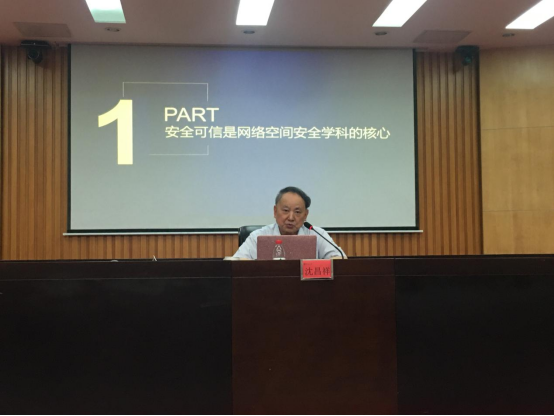 报告会上,沈昌祥院士首先介绍了网络空间安全人才培养的重要意义,他引用了习近平总书记在网络安全和信息化工作座谈会上的讲话指出“网络空间的竞争,归根结底是人才的竞争。建设网络强国,没有一支优秀的人才队伍,没有人才创造力迸发、活力涌流,是难以成功的”。沈昌祥院士介绍到,安全可信是网络空间安全学科的核心,网络空间已经成为继陆、海、空、天之后的第五大主权领域空间,从国家提出“没有网络安全就没有国家安全”的口号中可以看出网络安全的重要性,号召同学们努力学好本领,为国家安全贡献力量。