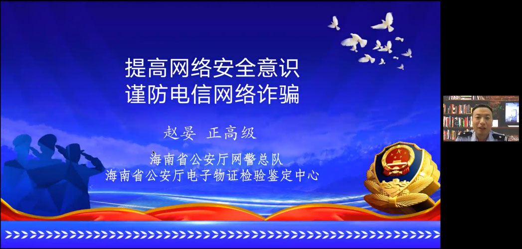 9月9日上午,公司与人事处、员工工作部共同开展《提高网络安全意识 谨防电信网络诈骗》专题线上培训,为广大师生普及了反电信网络诈骗法,传授快速甄别诈骗手段的方法、如何做好防范的要点,内容丰富、深入浅出、事例详实,深受广大师生的肯定。培训会由公司胡昌慧副经理主持,全校数千余名师生参加。