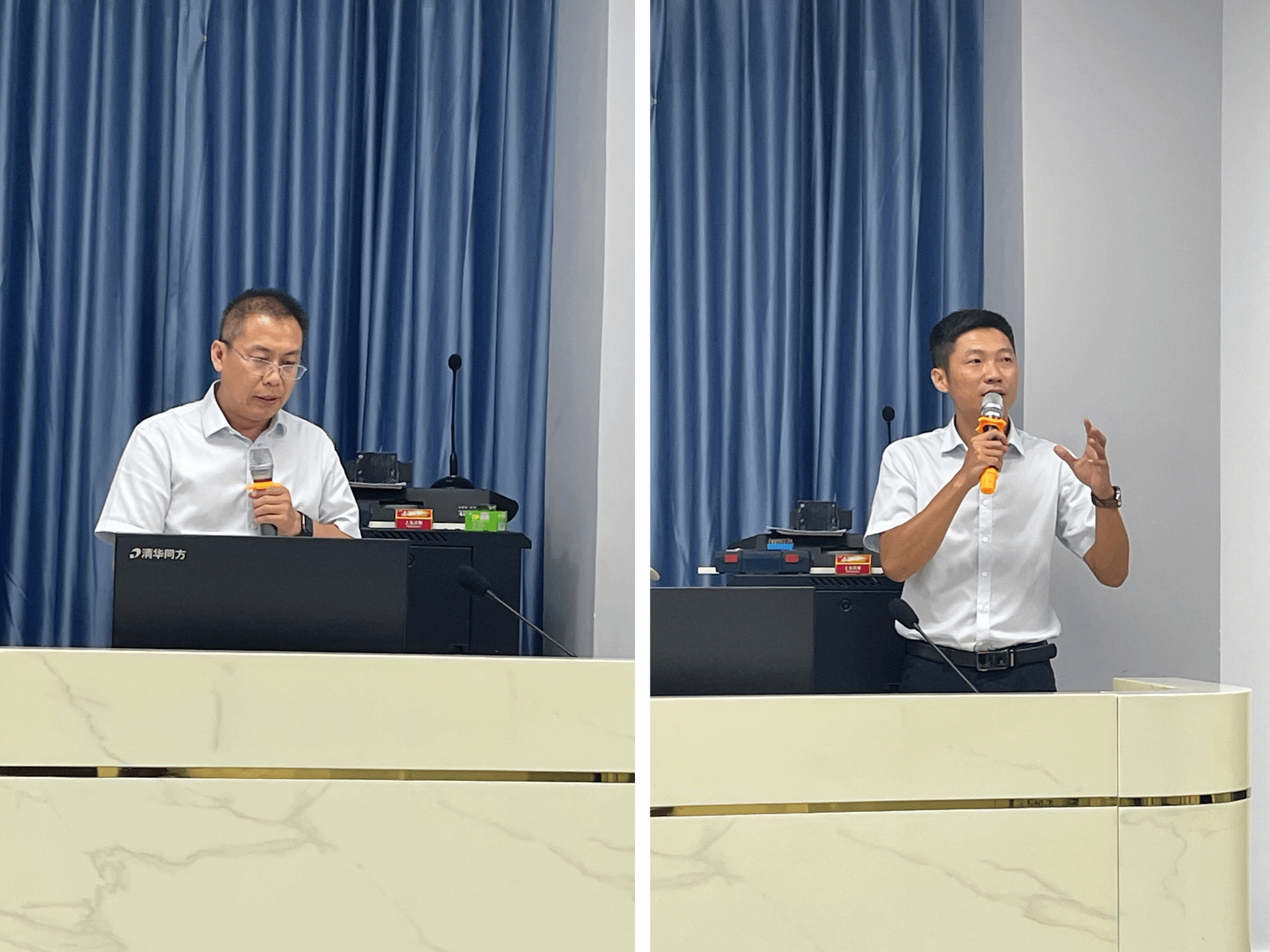 图2:曹春杰经理讲话(左一)、陈广锐书记讲话(右一)