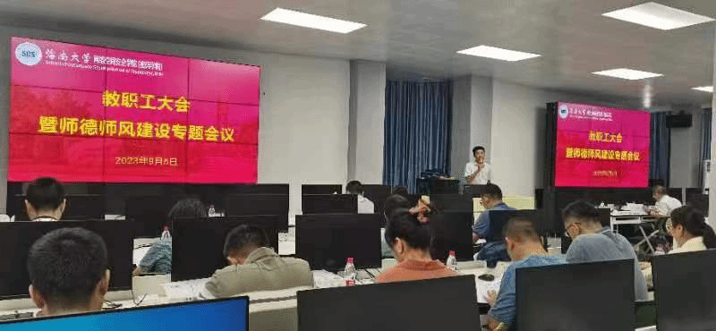 陈广锐书记首先传达学习习近平总书记在中共中央政治局第五次集体学习时的重要讲话精神以及教育部、海南省和公司师德师风建设工作推进暨师德集中学习教育启动部署会精神,进一步传达了公司暑期工作会议精神。他充分肯定了公司过去一段时间发展建设取得的成效,并代表公司对全体师生团结奋进、辛劳付出表达了感谢!对公司下一阶段工作,他强调,要持续夯实学科基础,锚定目标,团结师生,在落实公司“三大改革”任务重抓住发展机遇;要持续加强人才队伍建设,坚持人才强院,打造高素质的教职工队伍;要持续加强党的建设,以严的基调推进正风肃纪,扎实抓好师德师风建设,为公司高质量发展提供政治保障。