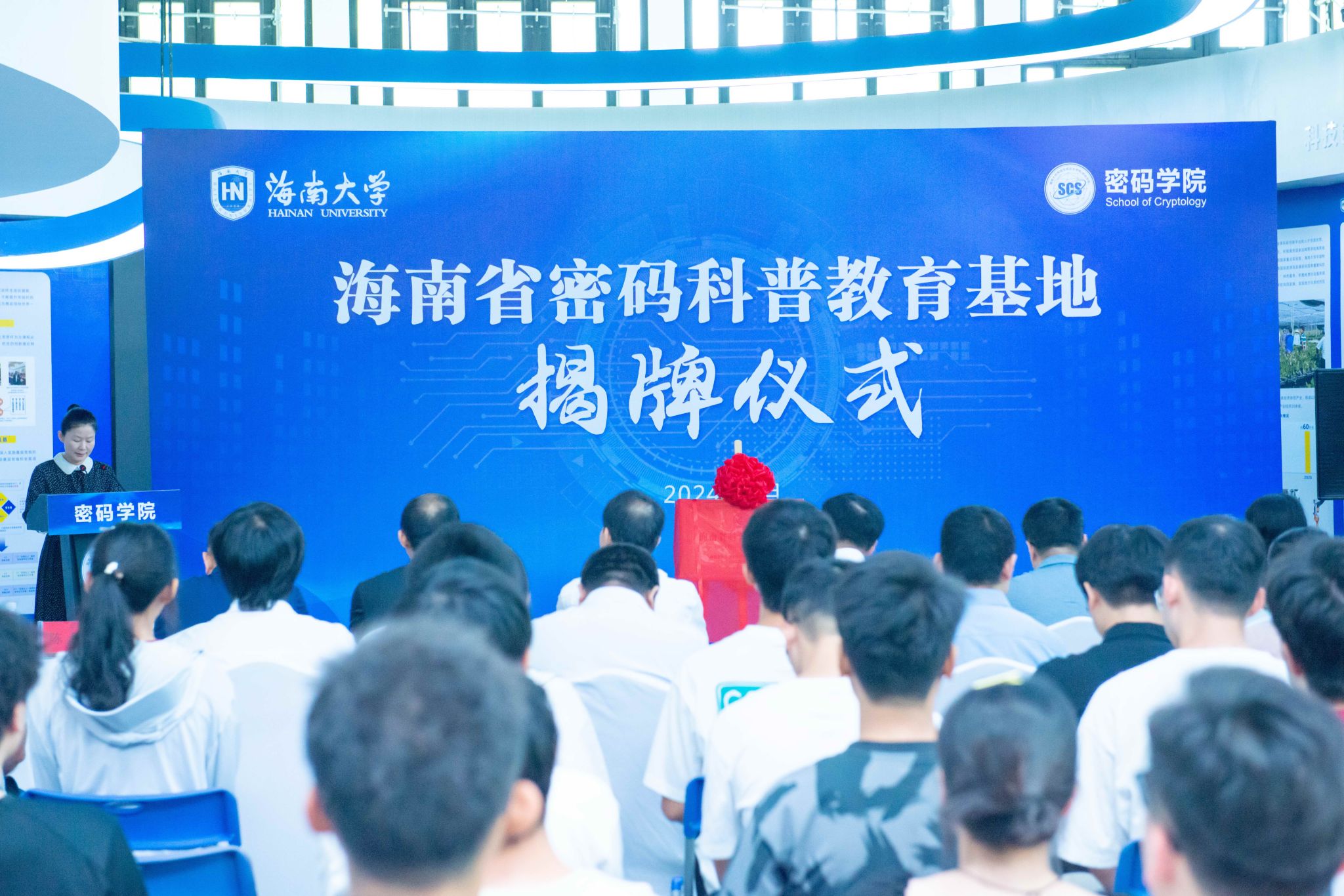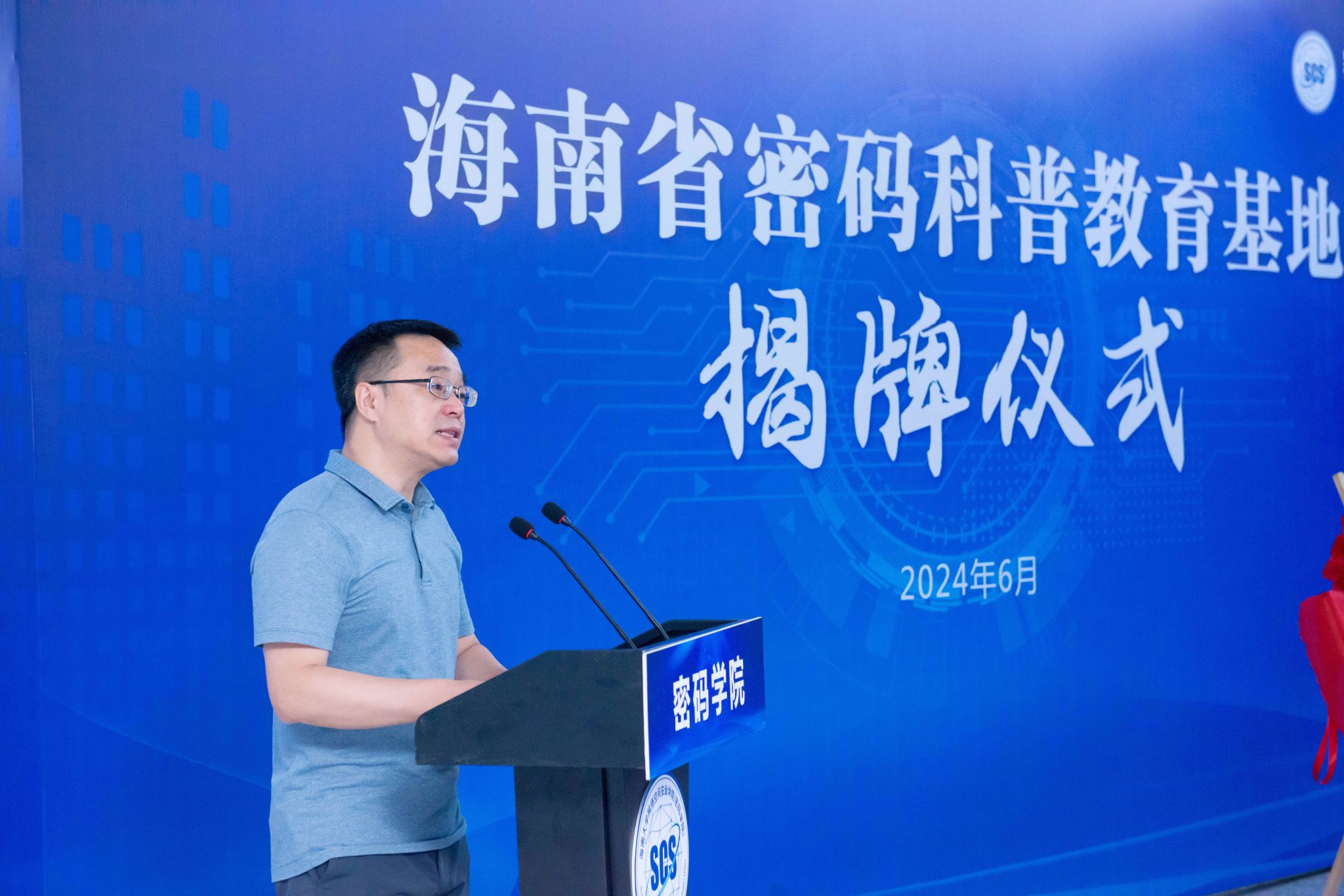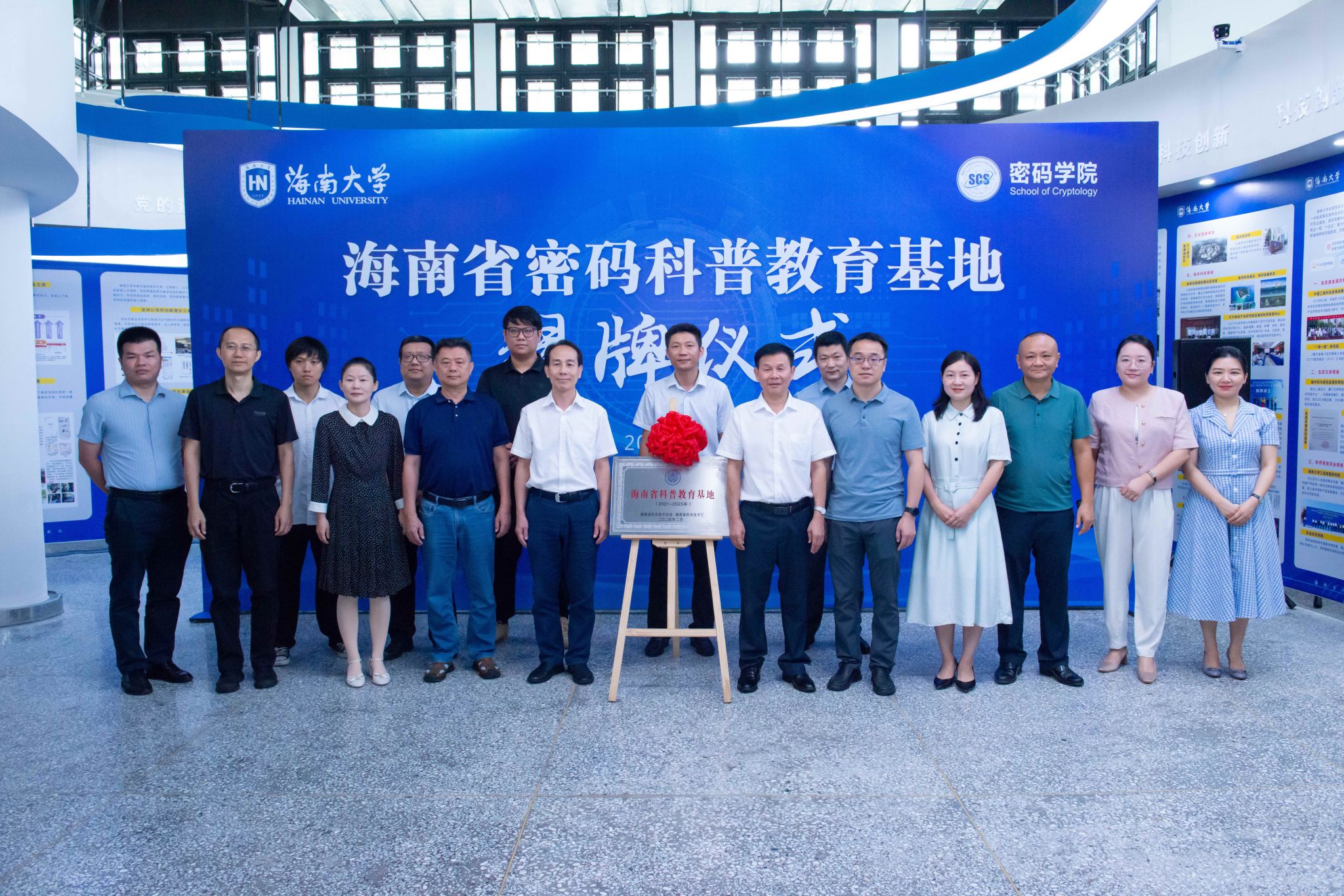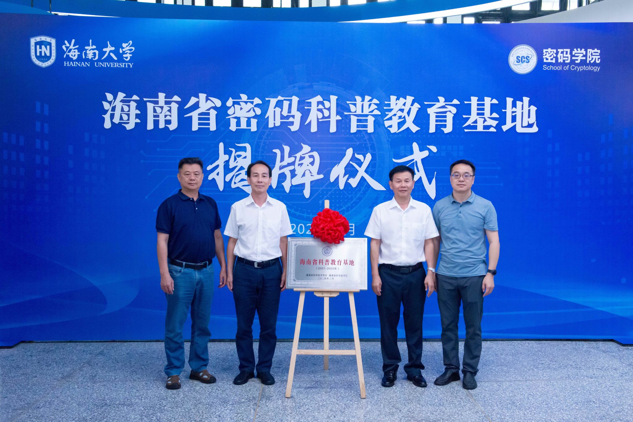 揭牌仪式上,海南省国家密码管理局局长蔡国杰,海南省科学技术协会二级巡视员吴钟海,海南省科学技术厅政策法规规划处副处长覃业敏,英国365集团官网党委常委、副董事长刘谦共同为海南省密码科普教育基地揭牌。