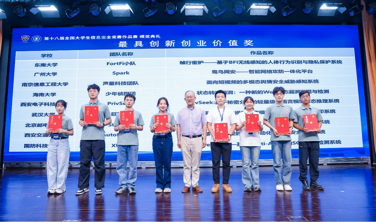 其中,《状态转换漏洞:一种新的Web竞态漏洞发现与检测》尤为突出,获“最具创新创业价值奖”,指导教师张玉清获“优秀指导教师”称号。“最具创新创业价值奖”为全国9支队伍之一,首次在此项比赛中实现了“零的突破”,岳秋玲老师指导的队伍分获三等奖和优胜奖。